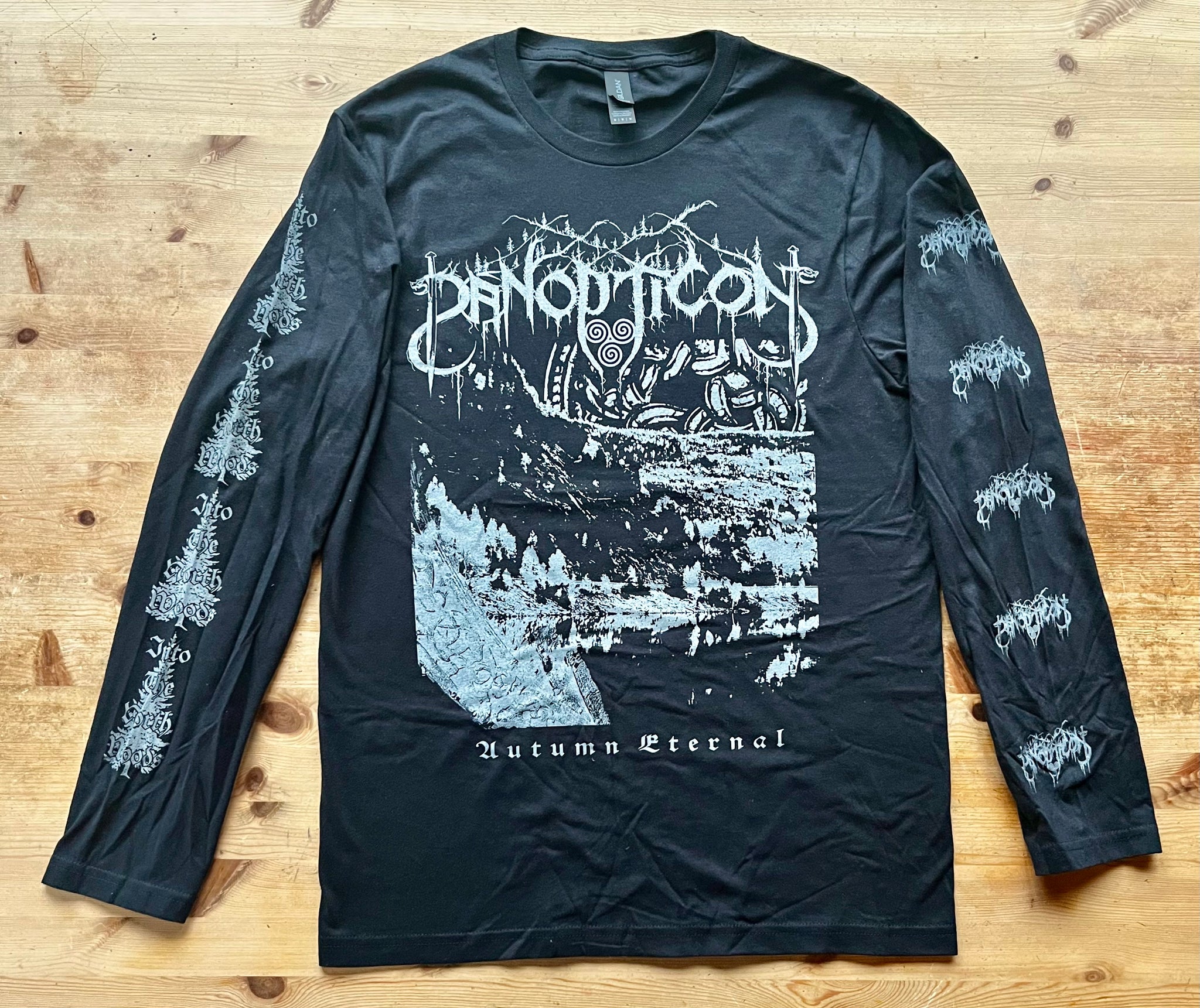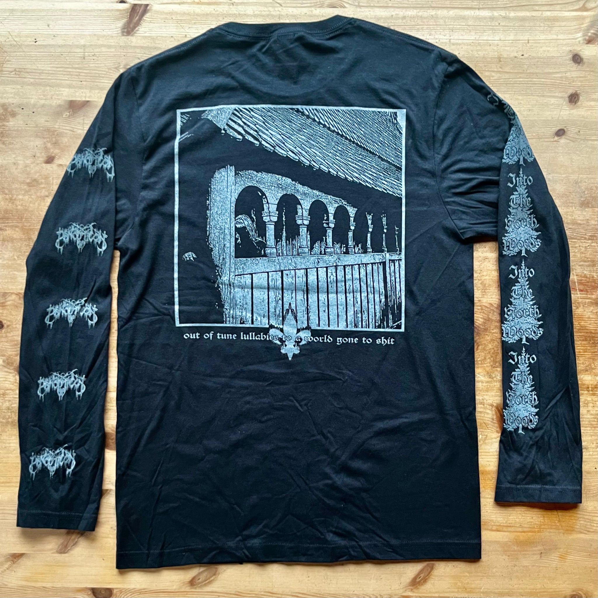 Silkscreened long sleeve black Gildan Softstyle shirt with one color front, back and sleeve prints in gray ink.